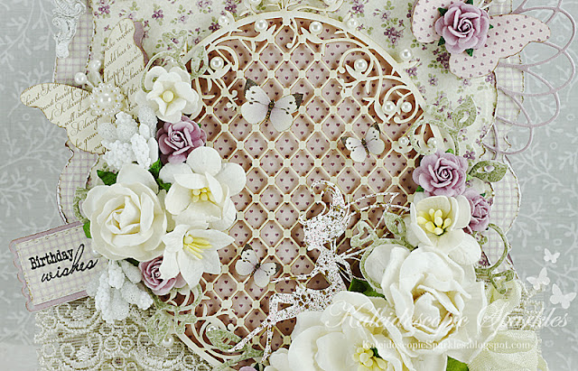I used two lovely Wycinanka chippies. ♥︎ The Blueberry Lattice serves as my focal point, with sweet Pion butterflies fluttering above. My blueberries have turned into pearls... birthday magic. ;) The Fairy is embossed with Shabby Pink Frantage for festive sparkle. ♥︎