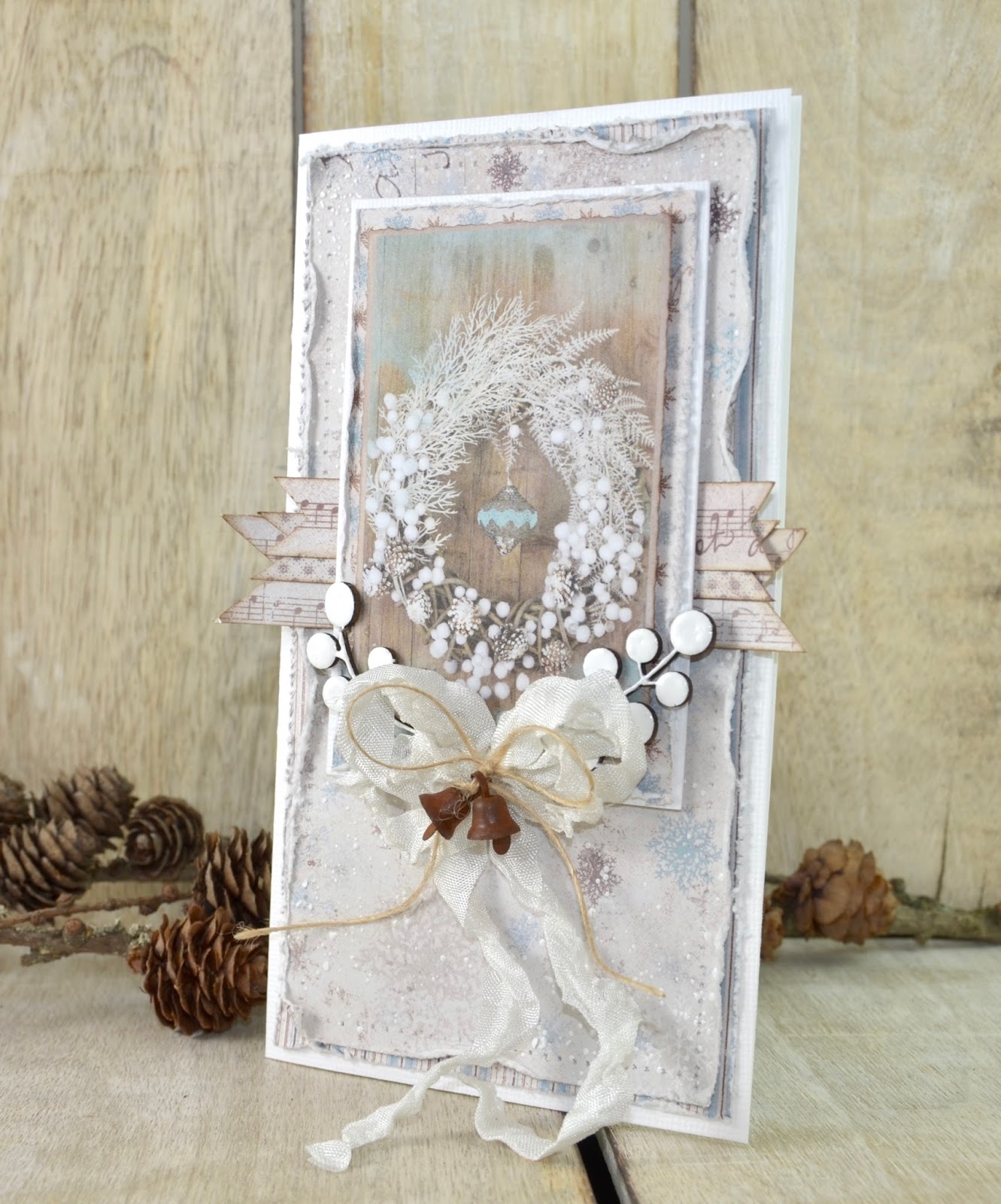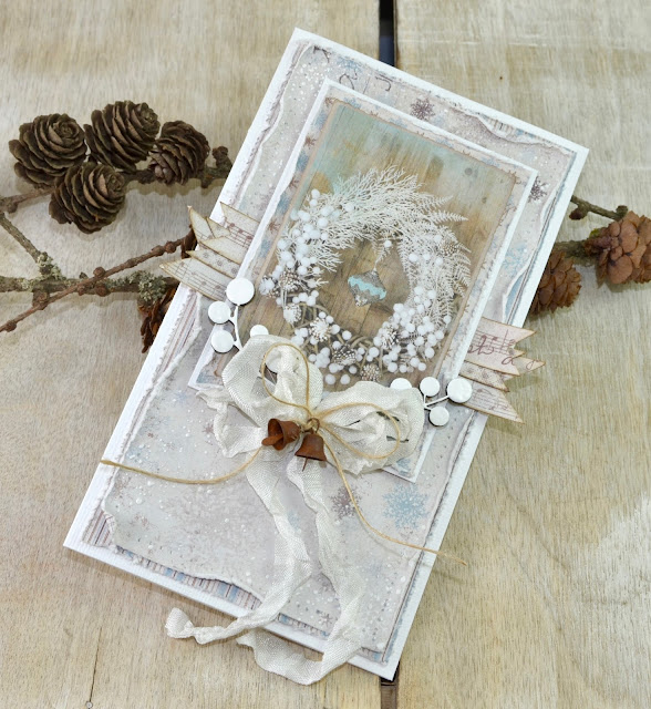 The whimsical Wycinanka Louvre Papillon frame has been adorned with pure white WOC blossoms and a sprinkling of Star Dust. This is one of my ultimate favorite chippies! It is encircled with Rockabilly ruffle trim, the most darling polka dot trim I have ever used. Wycinanka's Summer Wedding Border adds extra butterfly love.