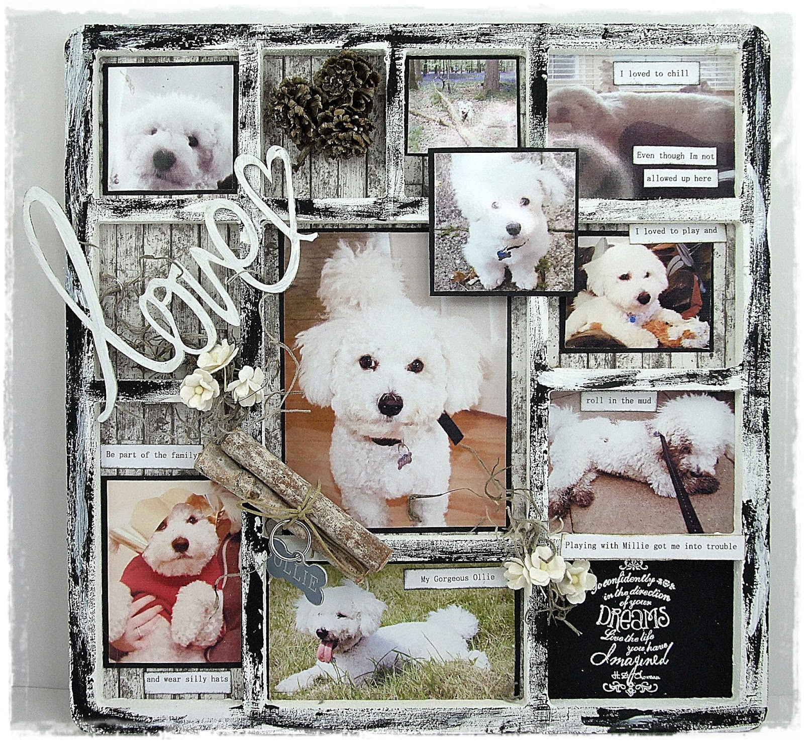 I have used Maya Design 1905 for the background paper and edged the MD frame in white gesso and black gesso. He was the most gorgeous Bichon I have every come across. He was a family member and as such he had to wear his Christmas jumper and his christmas hat. As you can see from the picture below, we used to go walking in the woods and Ollie would love fetching sticks, so I have added Cinnamon Sticks for this memory and you can see I have actually tied his tag using vax cord, the same tag he has on in the picture.
