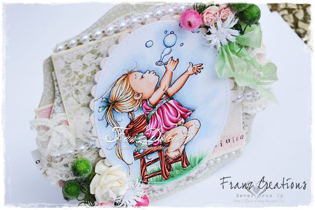 Since we are talking about a girl, I "had" to add a little touch of pink to this lovely Mo's character :) but during her birthday party, I found out that her bedroom is green, so the card was just perfect for her!