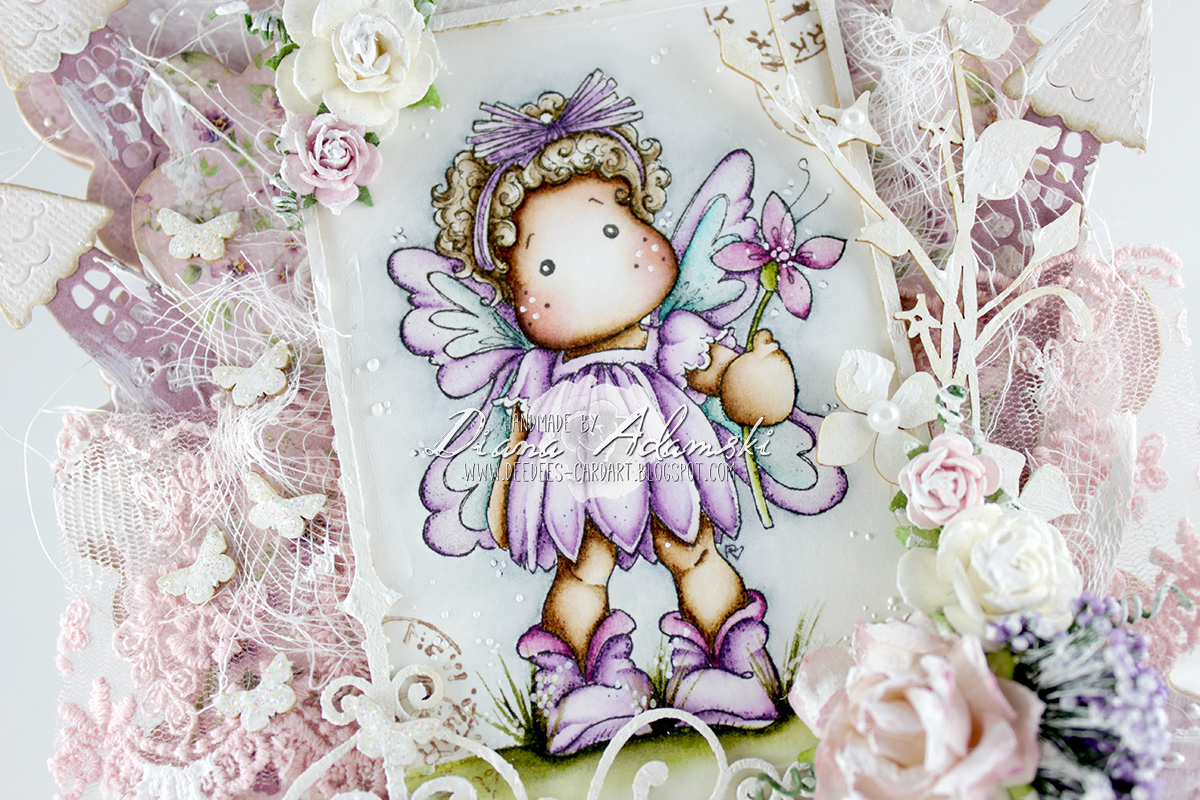 Diana is here and I want to share with you a cute little fairy card. I use some wonderful new Wycinanka Chipboard on this card. Papers are "Scent of Lavender", "Easter Greetings" and the "Pion Palette" all from PionDesign. Gorgeous new lace are also used here. The image is called "Summer Flower Tilda" by Magnolia. Hope you like it ans wish you all a nice day!